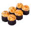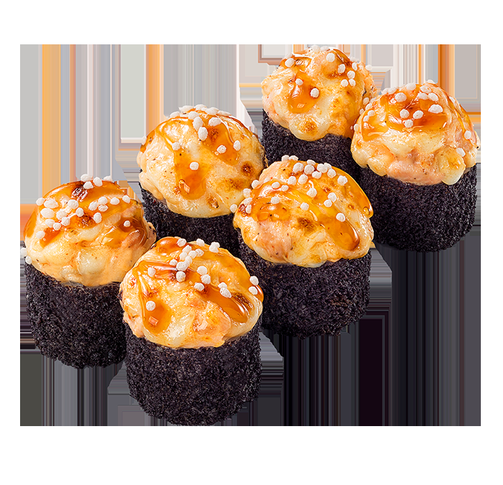 Ролл из снежного краба, огурца, майонеза и свежего филе лосося в чёрном кляре под запечённой шапочкой из трёх видов сыра. Украшен соусом терияки и воздушным рисом.