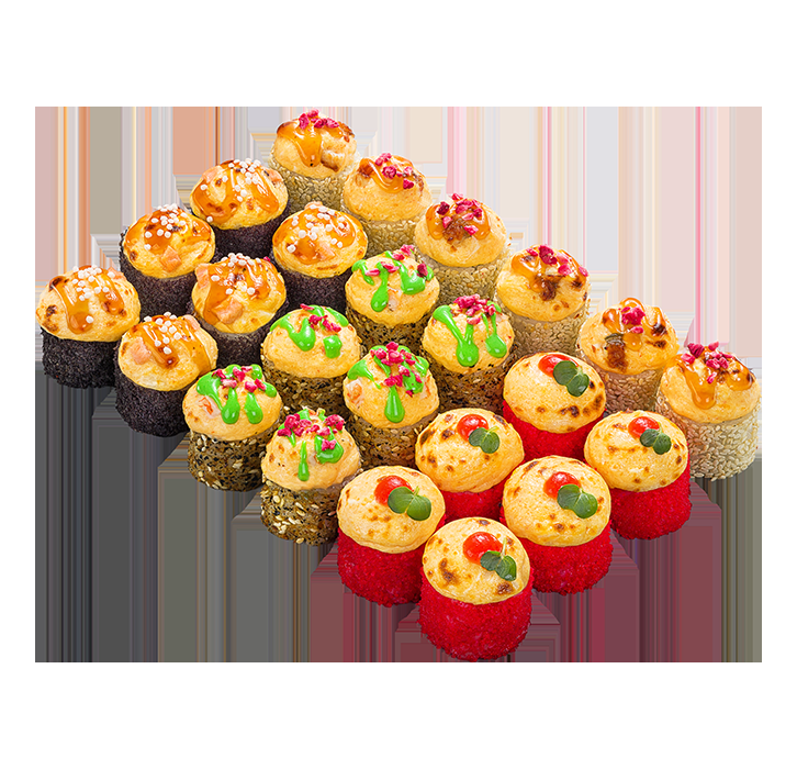 Сет из 4 запечённых роллов с лососем, гребешком, угрём и отварной креветкой под сырной шапочкой из трёх видов сыра. 24 шт.