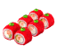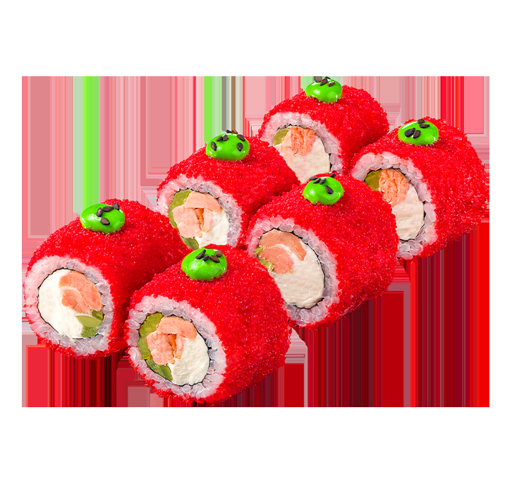 Ролл с маринованным в азиатском стиле жареным лососем, сливочным сыром и салатом джаз в икре масаго.