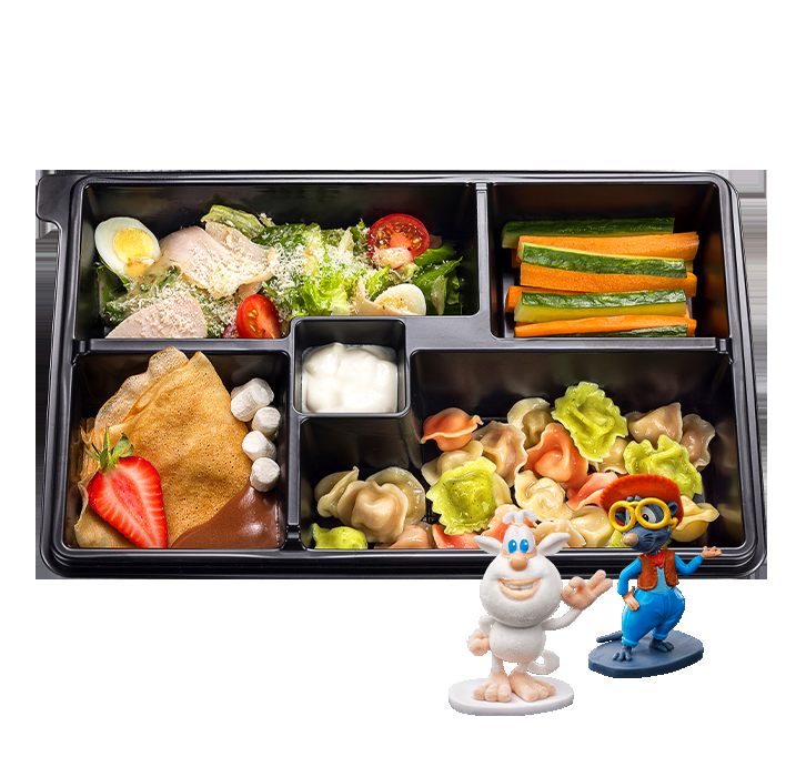 Детский набор с разноцветными пельмешками, овощными палочками, салатом Юный Цезарь и пшеничным блинчиком с шоколадным соусом. Игрушка БУБА в подарок. Акция не суммируется с другими скидками, акциями и спецпредложениями