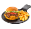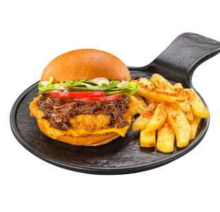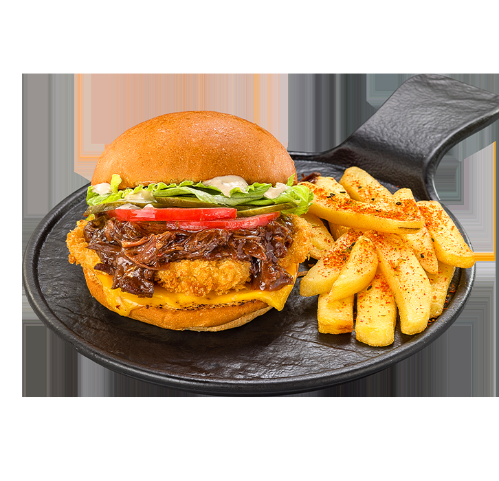 Каштановая булочка с томлёной говядиной, сыром чеддер, луковыми кольцами, томатами, маринованными огурчиками, салатом айсберг и соусом с чёрным перцем. Подаётся с картофелем фри со смесью перцев шичими тогараши