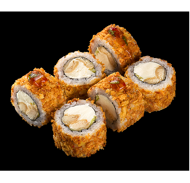Ролл с курицей темпура, сливочным сыром, луком сибулет, луком фри и соусом чили гарлик