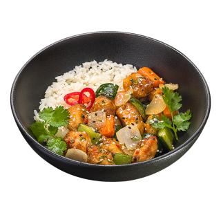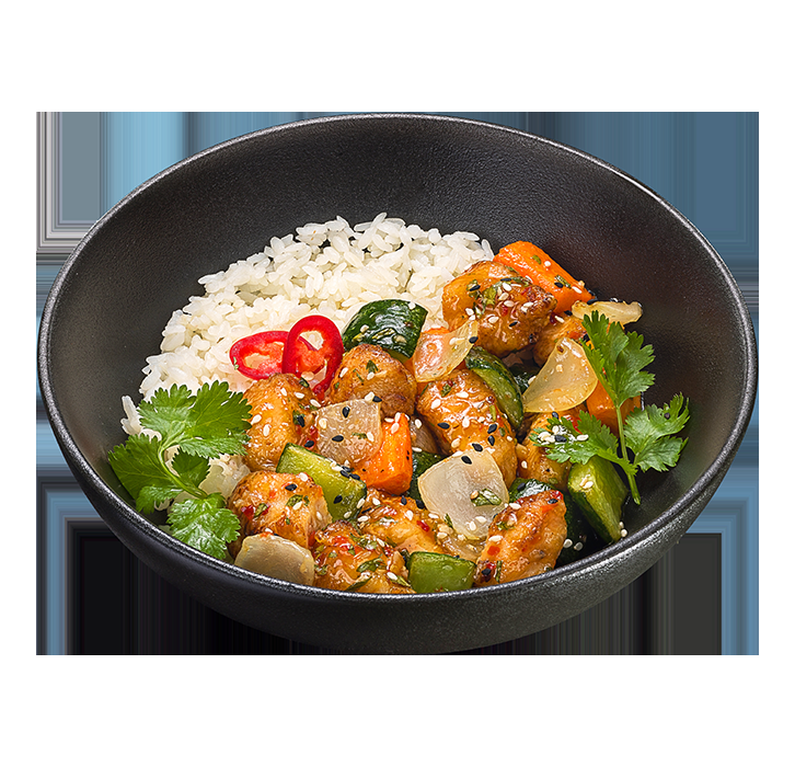 Нежное филе цыплёнка, огурцы, морковь, репчатый лук и арахис, тушенные в соусе чили гарлик. Сервируется паровым рисом, листьями ароматной кинзы, чёрным и белым кунжутом.