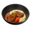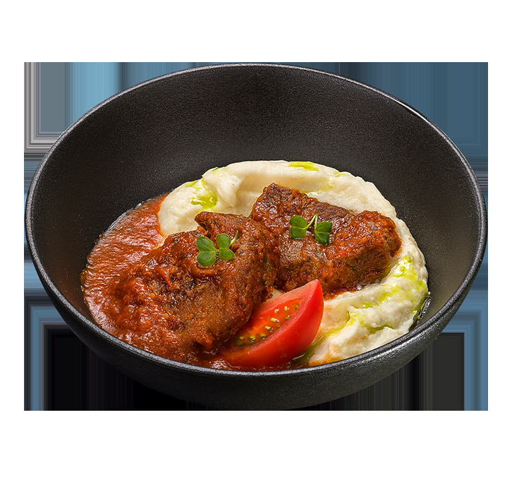 Говядина, томлённая в томатном соусе чили. Подаётся с нежным картофельным пюре, долькой свежего томата, зелёным маслом и микрозеленью.