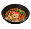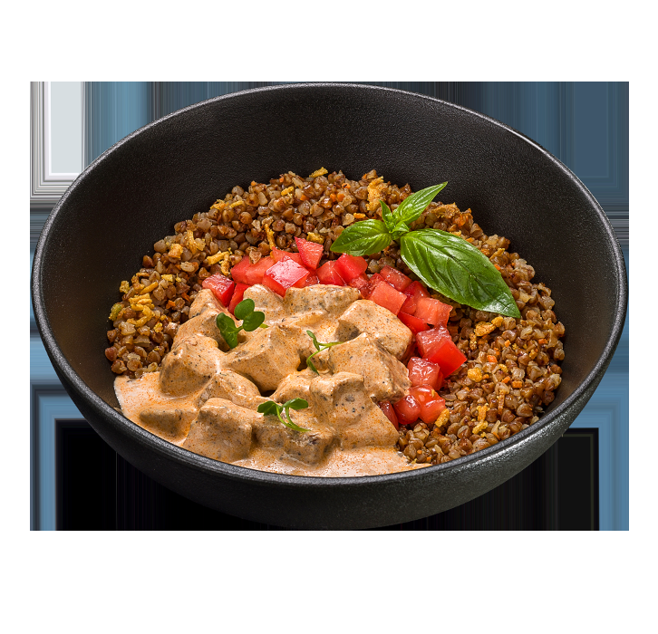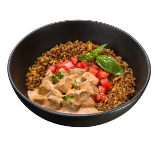 Говядина, тушённая в соусе чёрный перец. Подаётся с томлённой гречкой с морковью и репчатым луком, спелыми томатами и базиликом.
