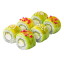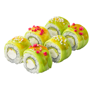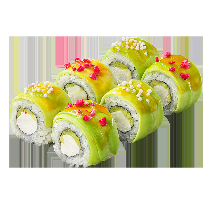Ролл со сливочным сыром и соусом гуакамоле. Сверху обёрнут в свежее авокадо и украшен соусом терияки, воздушным рисом и сублимированной малиной.