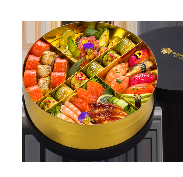 Подарочный сет из роллов Филадельфия, Хагакурэ и Канада. Суши с лососем, авокадо, тунцом, угрем и креветкой, тартаром из тунца и манго с авокадо гриль и ассорти сашими: лосось, угорь и отварная креветка.