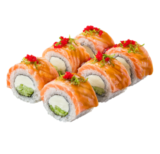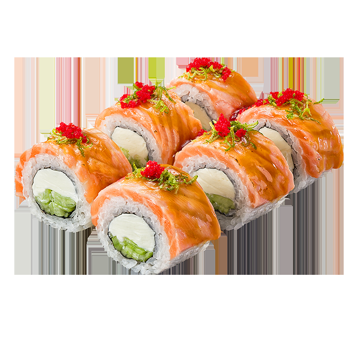 Ролл с обожжённым лососем, сливочным сыром, огурцом, соусом терияки, икрой масаго и цедрой лайма.