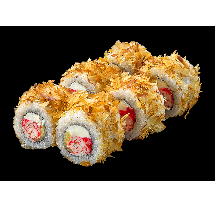 Ролл с крабом, сливочным сыром, луком сибулет, икрой тобико и стружкой тунца