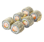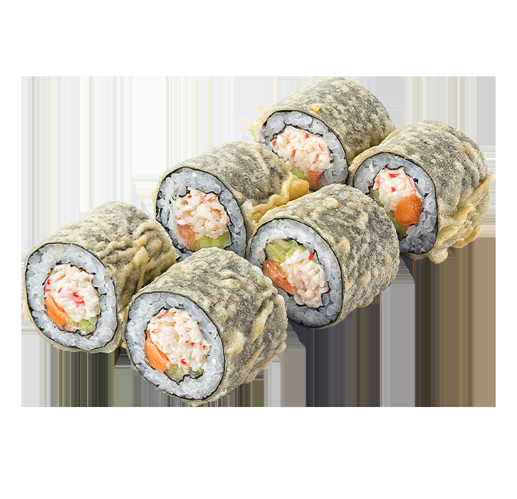 Ролл в кляре с копчёным лососем, огурцом, мясом краба и снежным крабом.
