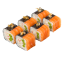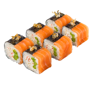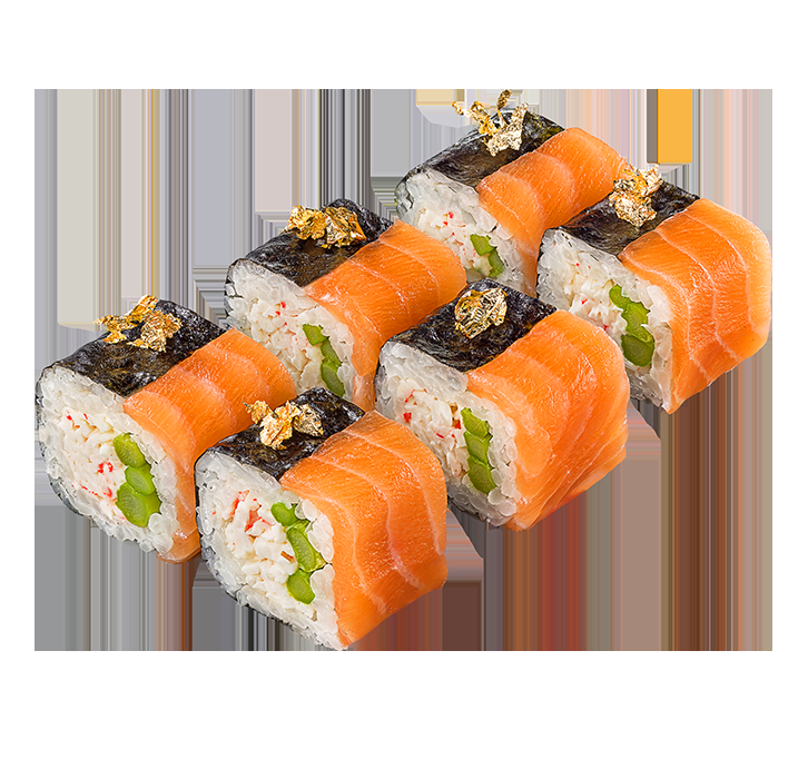 Ролл с начинкой из крабового мяса, бланшированной спаржи, снежного краба и майонеза. Покрыт свежим филе лосося и украшен пищевым золотом.