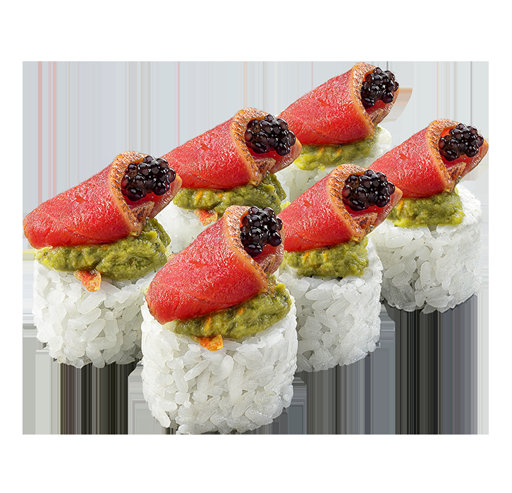 Ролл с сливочным сыром, соусом гуакамоле и татаки из тунца