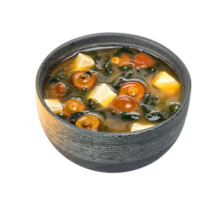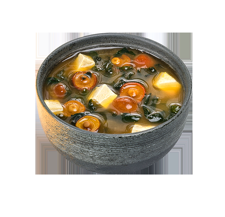 Традиционный суп с тофу, водорослями вакаме, грибами намеко и луком-пореем.