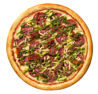 Пицца с кусочками острой вегетарианской колбасы, полусушёными томатами, постным сыром и соусами пронто и песто