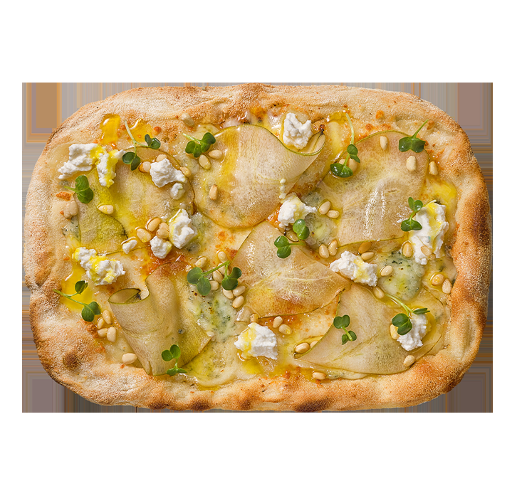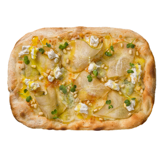 Хрустящая пицца с грушей, сливочным сыром рикотта, сыром дорблю, щедрой порцией меда и кедровых орешков в соленой карамели