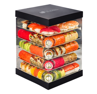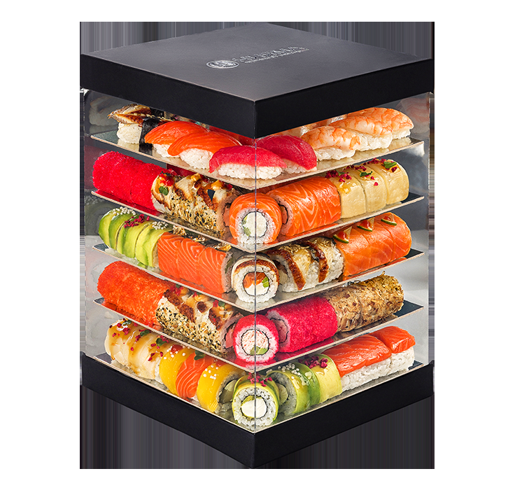 Подарочный сет из роллов Филадельфия, Калифорния, Канада, Хагакурэ, Сяке Бонито, Унаги Кранч, Оранж Чиз, Эби Шарп, Сиоми, Хотате, Филадельфия Лайт, Кинсей и суши с лососем, угрём, креветкой и тунцом. 88 шт.
