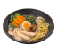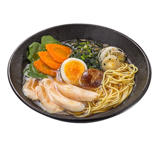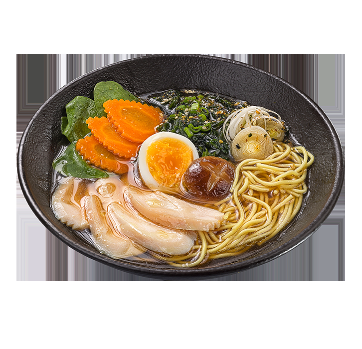 Ароматный, наваристый куриный бульон с яичной лапшой рамен, куриной грудкой, морковью, куриным яйцом, шпинатом, грибами шиитаке, зелёным луком и водорослями вакаме.