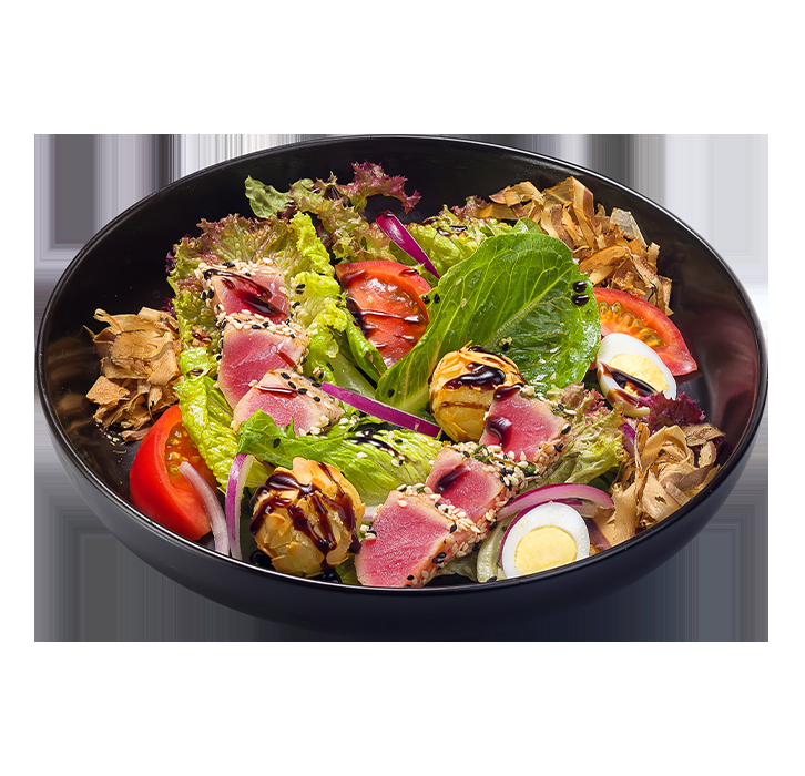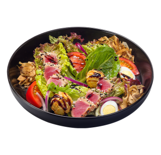 Микс салатных листьев, татаки из тунца на гриле, перепелиное яйцо, крокеты с картофельным пюре и заправкой на основе лайма. Украшен свежими томатами, красным луком и бальзамическим кремом.