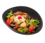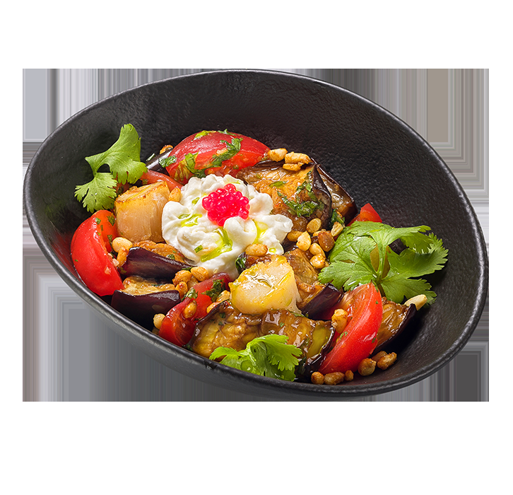 Маринованные баклажаны и томаты, обжаренные гребешки с домашним сыром страчателла и заправкой из соуса сладкий чили. Украшен кедровыми орешками и малиновой икрой тапиоки.