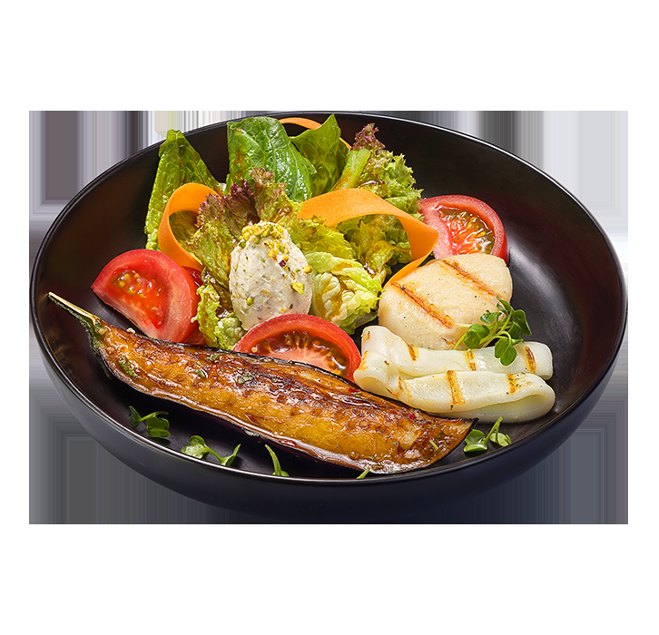 Микс салатных листьев, свежая морковь с соусом ясай, маринованный в соусе сладкий чили баклажан, свежие томаты, гребешок и филе кальмара обжаренное на гриле. Подаётся с фисташковым йогуртом.