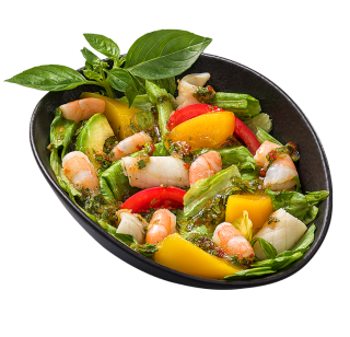 Салат с обжаренными креветками, томатами, кальмаром, авокадо и маринованным манго с заправкой из соуса чили.