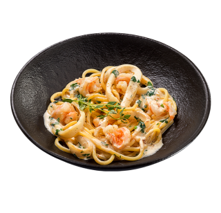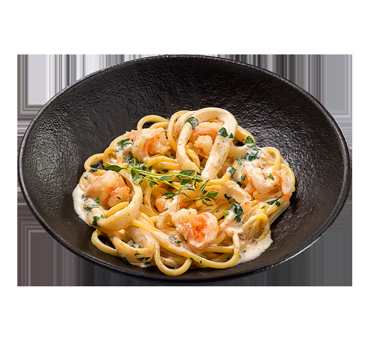 Спагетти с креветками и кальмаром в сливочно-устричном соусе.