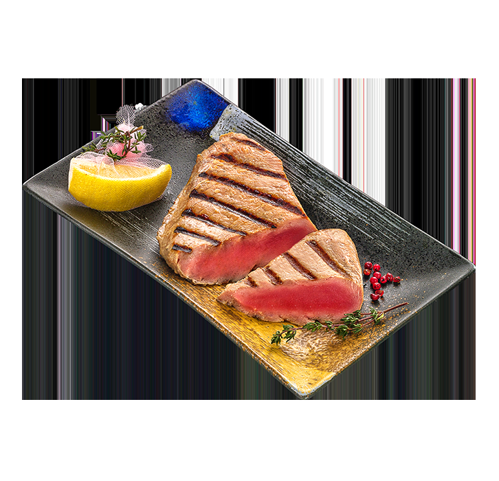 Маринованное филе тунца в оливковом масле с солью, перцем, тимьяном и чесноком, обжаривается на гриле по методу татаки - обжарке подлежит только внешняя часть филе, внутри тунец остаётся сырым.