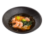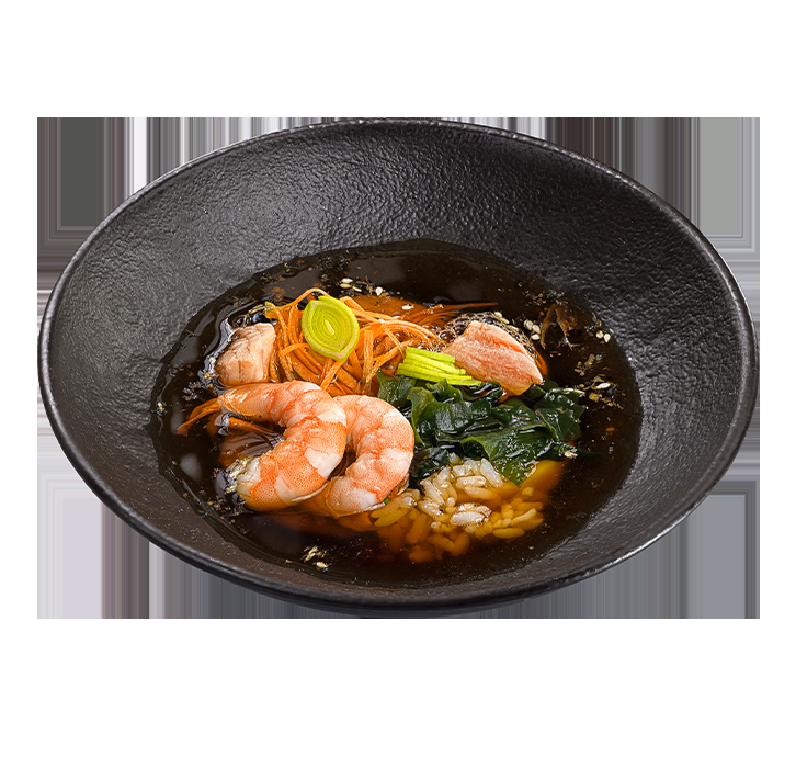 Наваристый рыбный бульон с тигровыми креветками, свежим лососем, луком-пореем, морковью, рисом и водорослями