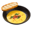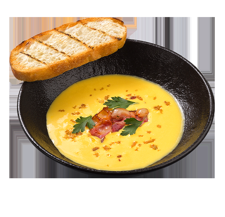 Нежный сырный суп с беконом, зеленью и луком фри. Подаётся с хрустящей чиабаттой.