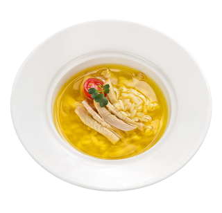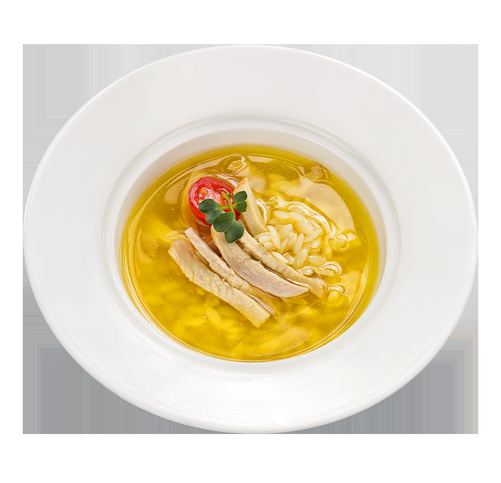 Куриный бульончик с цыпленком, пастой орзо и томатами черри.