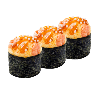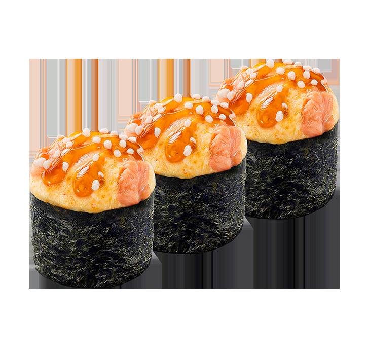 Гунканы со свежим лососем под запечённой шапочкой из трёх видов сыра, украшается соусом "Терияки" и воздушным рисом.