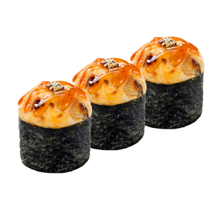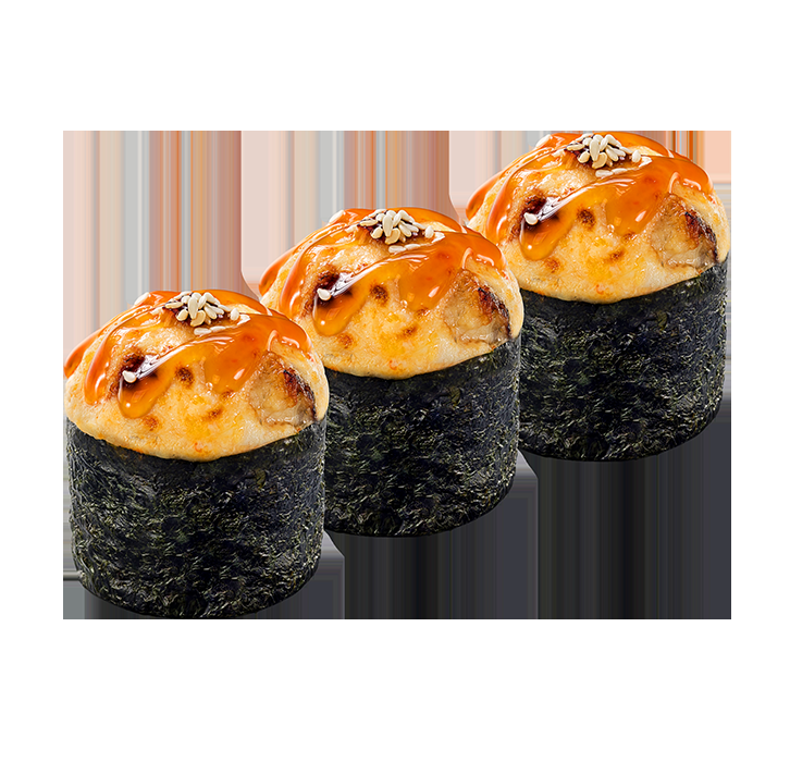 Гунканы с копчёным угрём под запечённой шапочкой из трёх видов сыра с соусом "Терияки" и белым кунжутом.