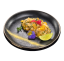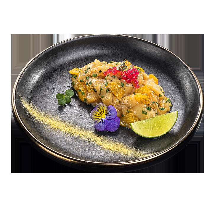 Свежий сахалинский гребешок с кусочками апельсина, цитрусовым маслом и малиновой икрой тапиоки.