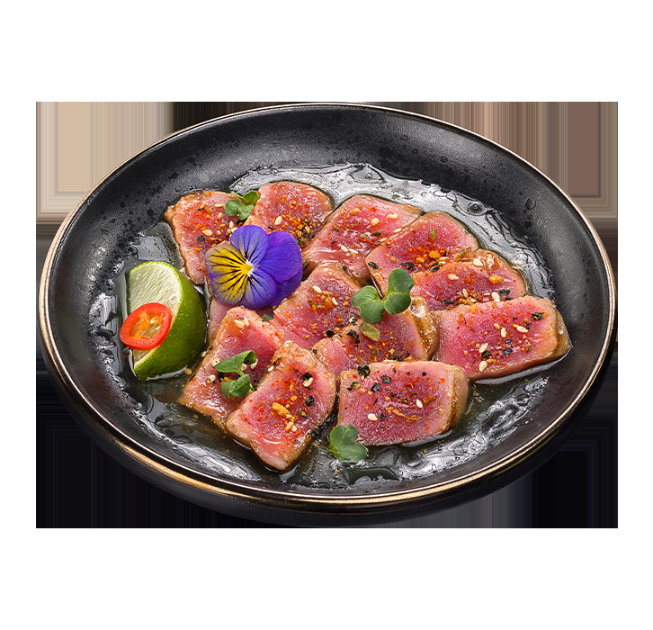 Татаки из филе тунца, обжаренного на кунжутном масле и заправленного соусом юдзу.