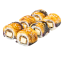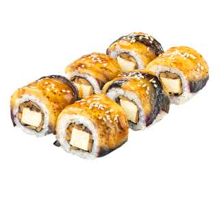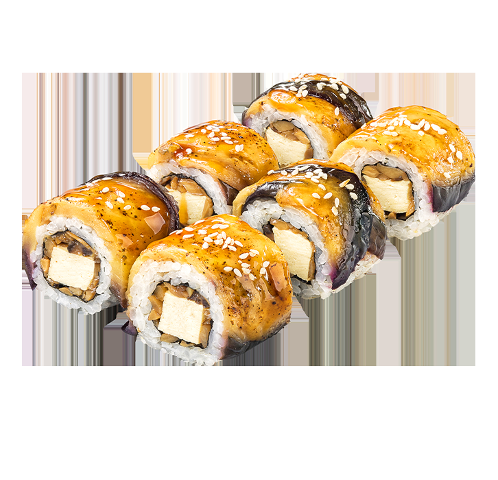 Ролл с обжаренными шампиньонами, вёшенками и тофу под шапкой из печёных баклажанов под соусом терияки.