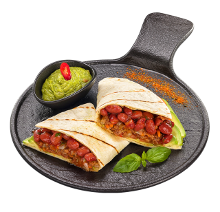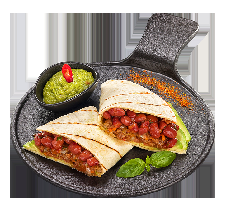 Тортилья с овощами, растительным фаршем с высоким содержанием белка бобовых и злаковых культур, фасолью чили и соусом гуакамоле.