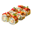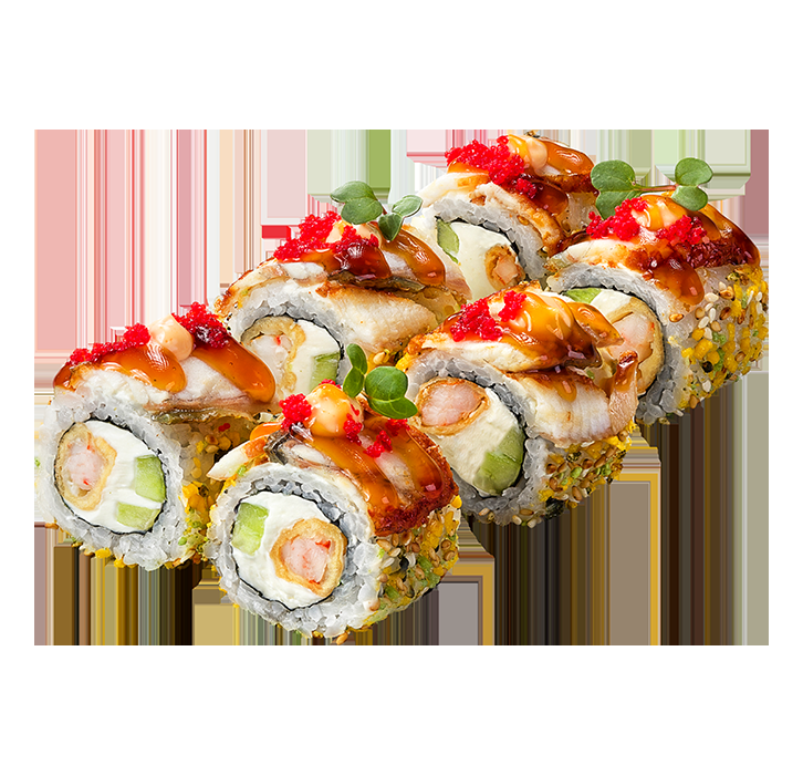 Ролл с угрём, креветками темпура, огурцом, сливочным сыром, украшен рыбным пабираном, икрой масаго, соусами спайси и терияки.