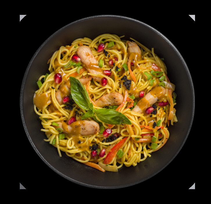 Популярное блюдо на улицах одноимённого острова, яичная лапша рамен с маринованной курицей под соусом карри на кокосовом молоке. Подаётся с зёрнами граната и ароматными листьями свежего базилика.