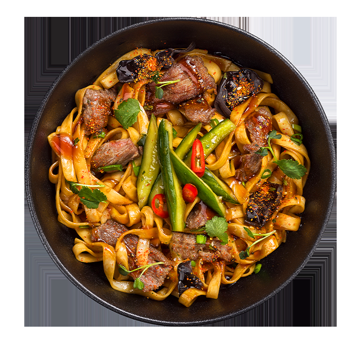 Традиционная острая пшеничная лапша удон с говядиной в авторском исполнении с острыми маринованными огурцами и смесью ароматных перцев.